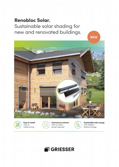 At the heart is the solar power kit, with which they all come as standard. The kit, which uses renewable solar energy to comfortably open and close the shading system, consists of a radio-controlled motor, a battery and a solar panel, all fully pre-wired. Once the easily accessible battery is connected via its pre-installed plug, the Griesser sustainable solar shading product is ready for use.