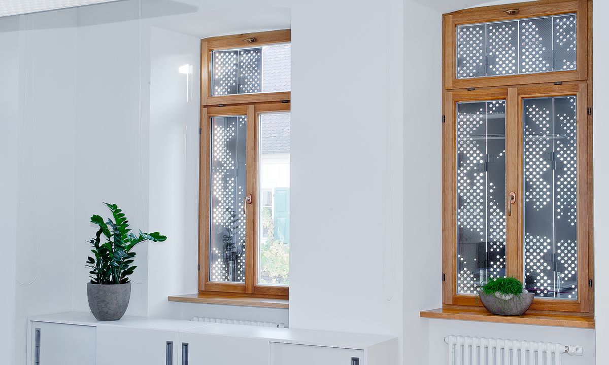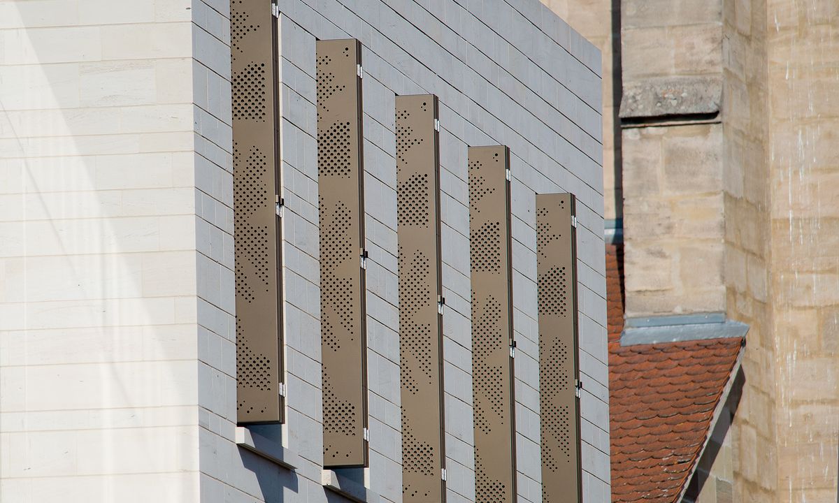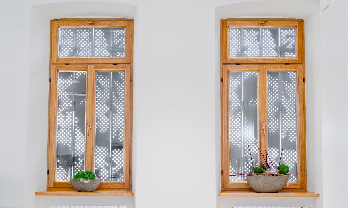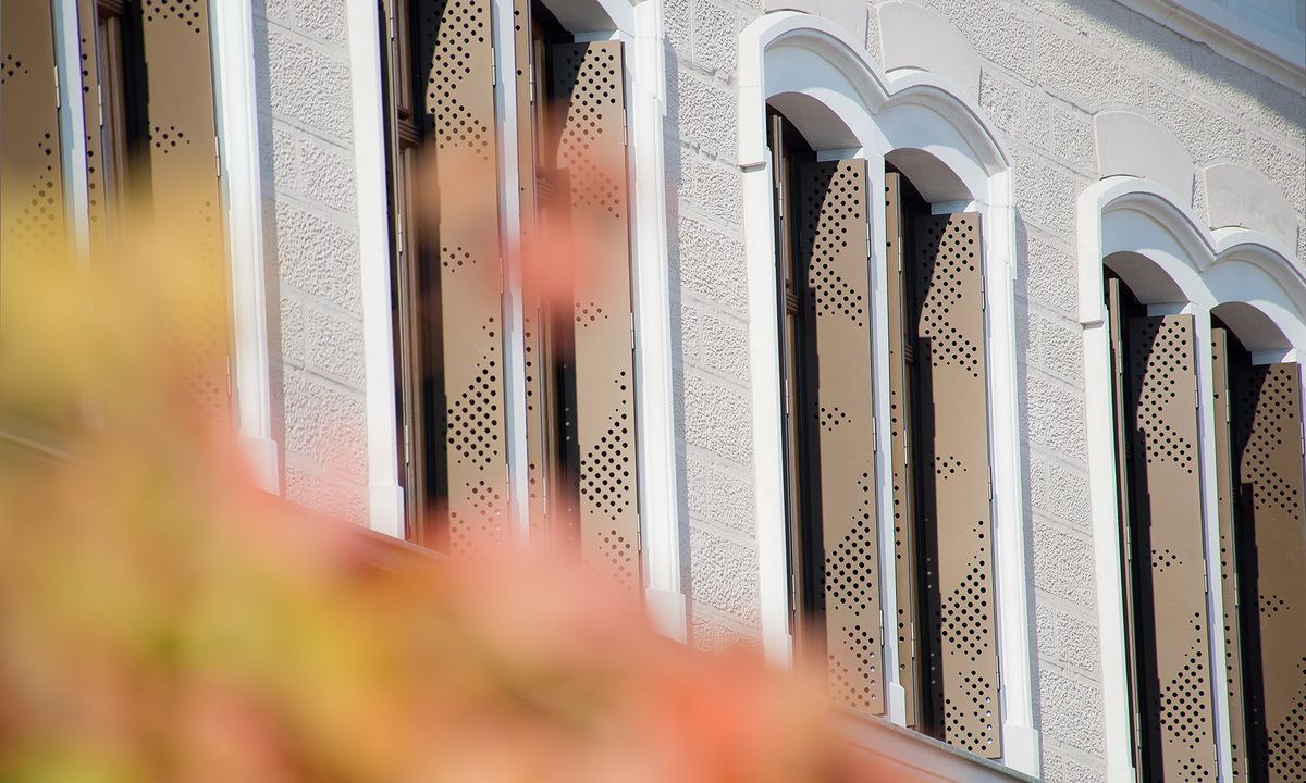In accordance with customer preference, the wing shutters were designed as perforated 10 mm aluminum plates without frames. The predefined perforation brings wonderful light effects into the interior of the building and recalls Iphofen's history of wine-making. In line with the overall concept, the STYLE - special color IGP 4201E82291A3F – a warm brown tone – was selected. The wing shutters were ordered as Diagram 4, i.e. four shutters per window including ball catches for fastening. The armatures selected were completely traditional, with universal bands and screw clamps.