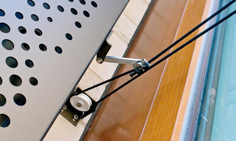 Model SL with the narrow frame was used for the sliding bi-fold shutters. The perforation corresponds to those of the wing shutters and lends a uniform appearance to all of the window roller shutters. The beautiful ambient light resulting from the perforation pattern is also appreciated here. A cable pull is used to operate the sliding bi-fold shutters. Special feature - when in closed position, aluminum wedges between the sashes lead to a "rippling look".