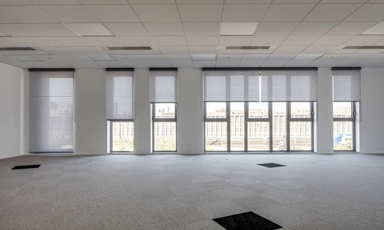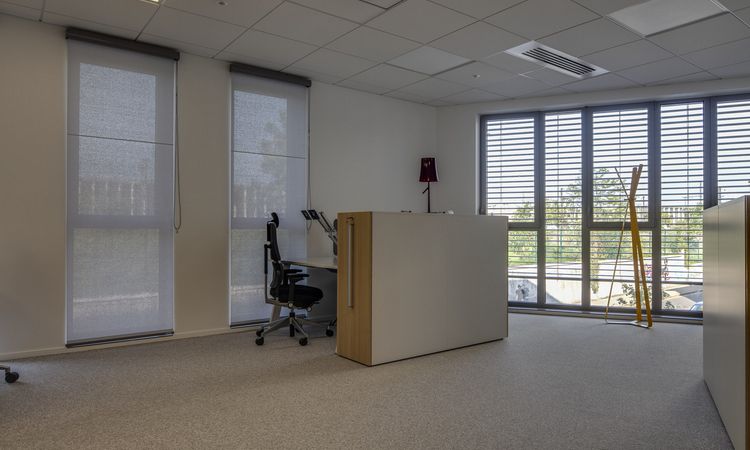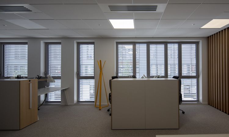 The recesses produce natural lighting that creates a warm workplace. Griesser offered an efficient response to the need for quality solar protection with 250 Solomatic 80 Fix external venetian blind with beaded slats and 200 Soloroll Box Internal roller blinds.