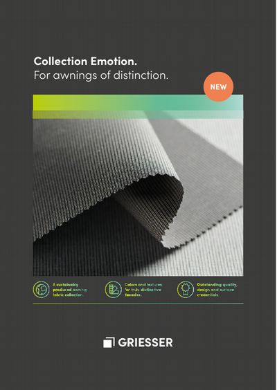 Griesser presents the Collection Emotion with 50 different designs ranging from timeless to creative. A selection of fabrics from the modern basics blue® collection sets completely new standards in terms of sustainability: the fabric consists of 85 percent recycled PET. The production process also uses 90 percent less water than traditional dyeing, 60 percent less energy and 45 percent less carbon dioxide.