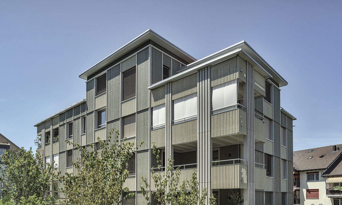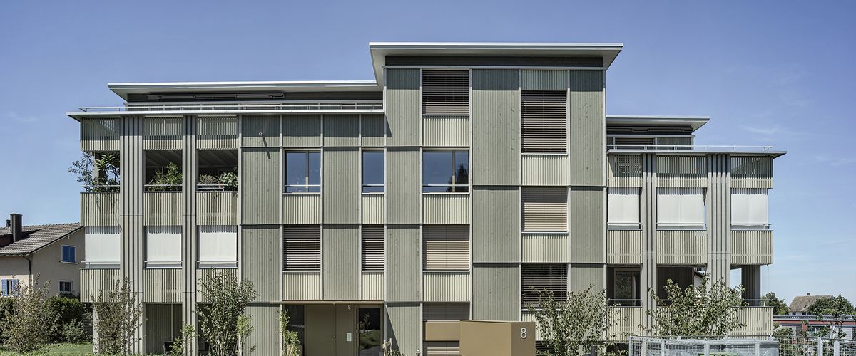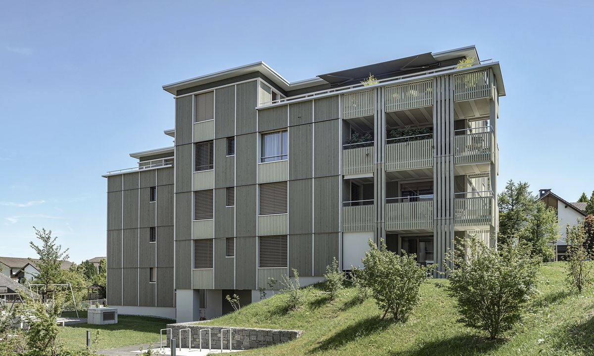Completed in 2021, the apartment building with 11 rental apartments in Oetwil am See is a real eye-catcher, combining stylish design with natural materials. Surrounded by attractive green spaces, the wooden facade blends harmoniously into its environment, offering a streamlined and airy impression of the building, despite its 4 floors, thanks to the narrow boards and natural coloring.
