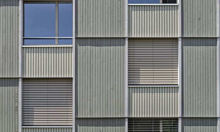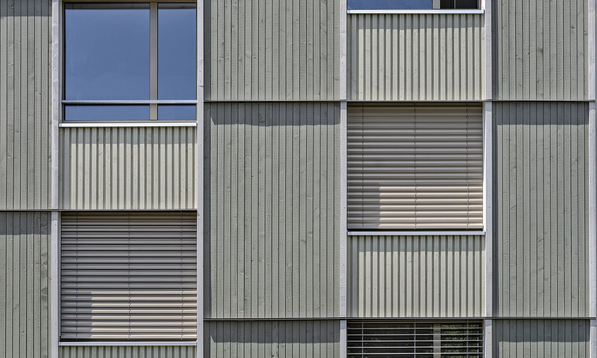 Griesser's popular Lamisol III 90 Fix external venetian blind with profile slats were chosen for the solar shading on the sand-colored wood-metal windows. These were color-coordinated with the facade and window frames in an elegant beige (NCS S 5010-Y10R) with a golden shimmer.
