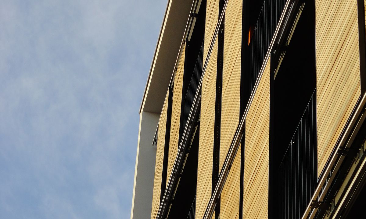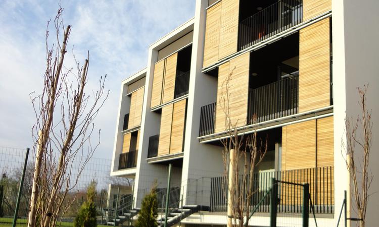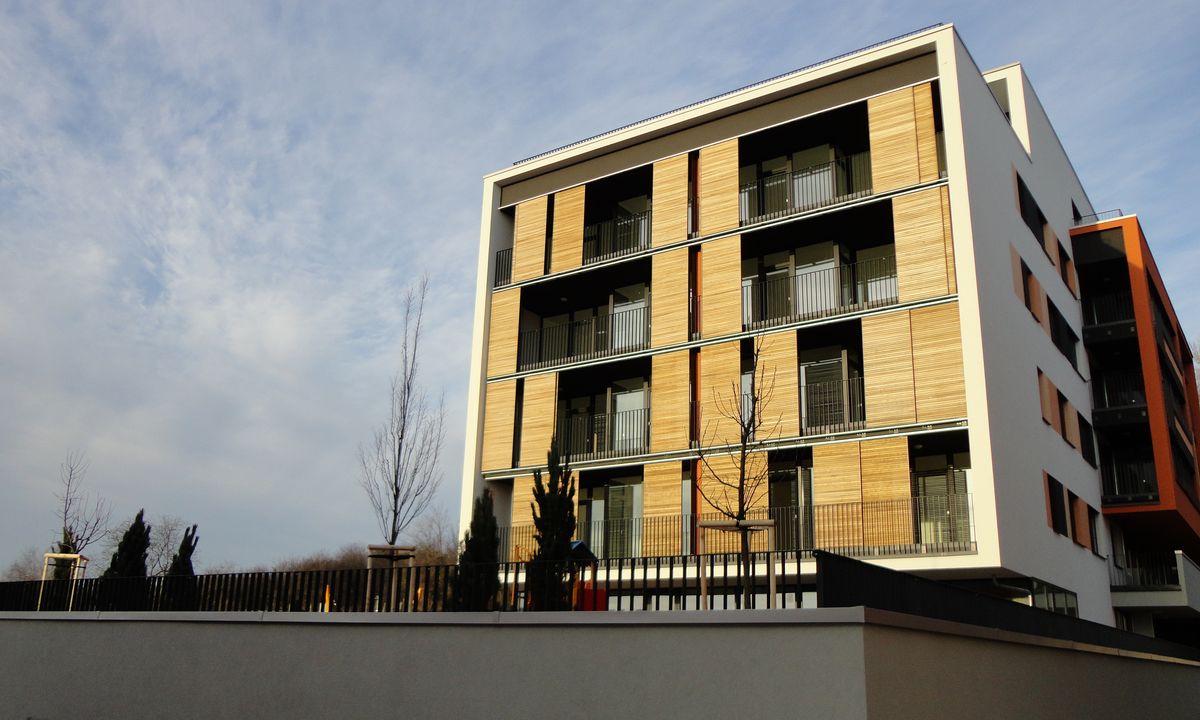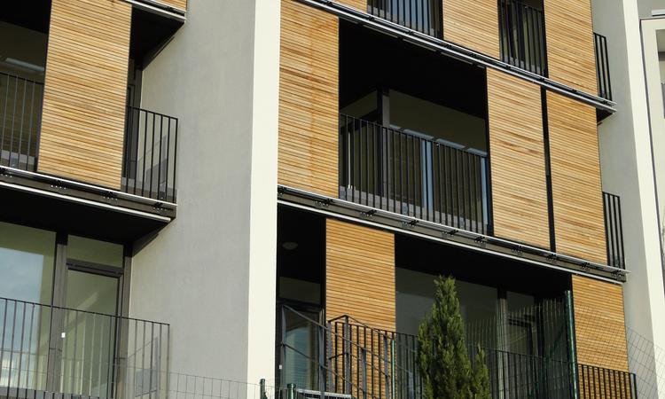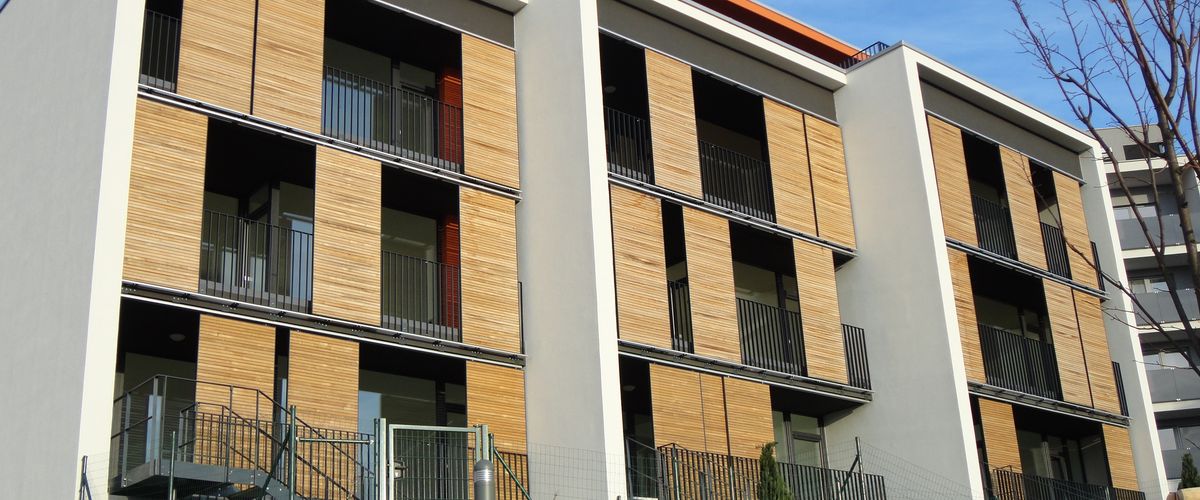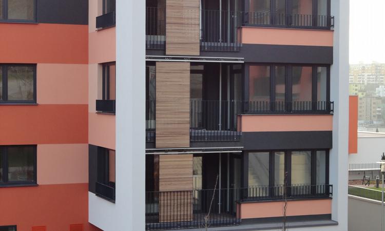 The four buildings, facing southwest, are quite a sight with over 140 Griesser sliding shutter elements. The shutters, positioned in front of the balconies, offer both privacy and solar shading while the Model H Wood which was used still allows a defined amount of daylight. In addition to their functional use for shade, the panels are also a very considerable architectural element.