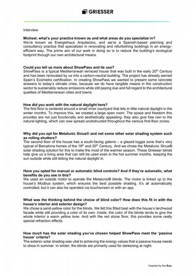 Architectural practice Energiehaus Arquitectos has taken the opportunity offered by the renovation of a Mediterranean terraced home to create the first carbon-neutral ‘passive house’ in Barcelona, Spain. Griesser’s Metalunic Sinus® venetian blinds play a central part in this sustainability project, which is also known as ‘ShowPass’ (as it demonstrates the passive house concept). The Griesser blinds don’t just make a major ecological contribution, either: they also help showcase the building’s outstanding design.