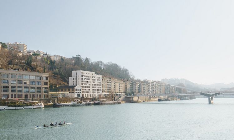The building ends somewhat short of its plot boundary to the north, creating a visual space between two key adjacent landscape elements: the Saône River in front and the wooded Croix Rousse hill behind.