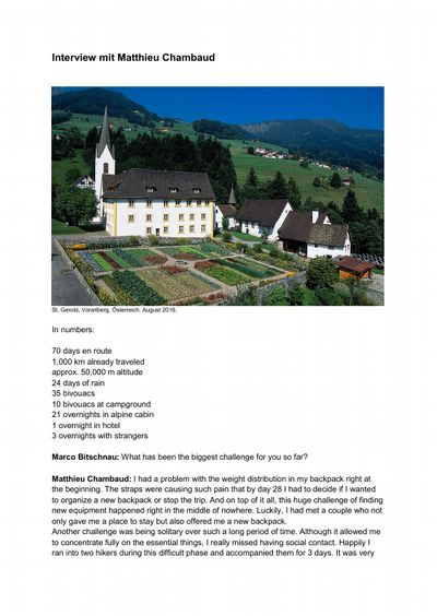 The goal of the “Via Alpina l’envers du chemin“ tour is to make a documentary film about the parallel worlds of the long-distance hiker in addition to showing the physical stresses that must be overcome. A series of interviews will be conducted to find answers to the following questions: