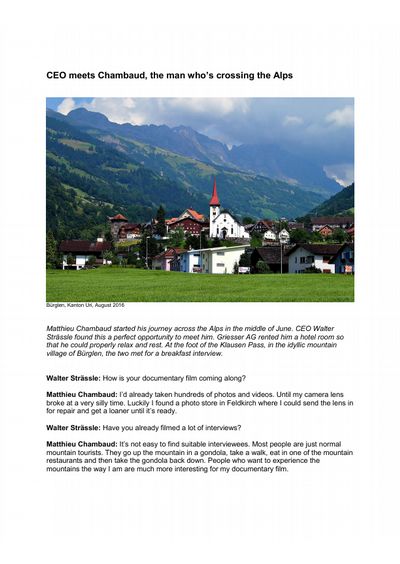 Griesser AG will be meeting Matthieu Chambaud at six different locations in the Alps to interview him about his experiences and the specific characteristics of the regions he hikes. These interviews will be published along with fascinating photos and videos at www.griesser.ch/new. We will also be updating the hiker’s current position daily and linking it with photos. You can experience it day by day.