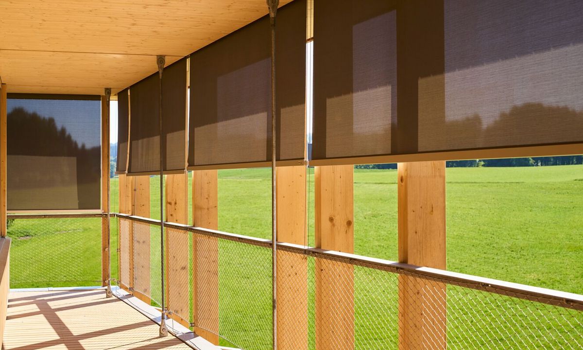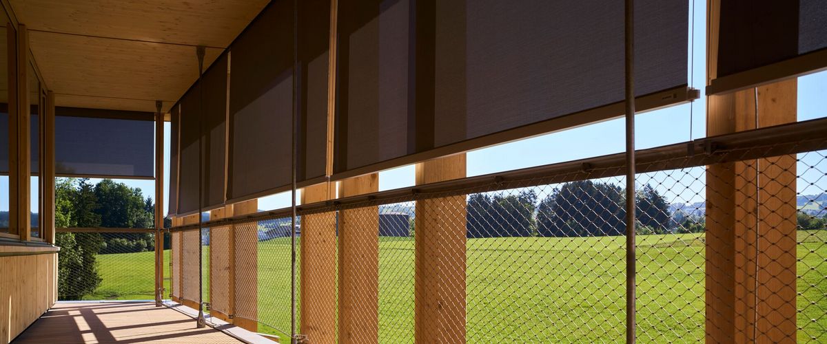 Intensive preliminary investigations and tests made it possible to install the Griesser awnings, which would otherwise have been mounted directly on the facade, further forward on the wooden building in Gossau, as Michael Helbling, Regional Manager Projects Eastern Switzerland at Griesser, explains: "Due to the wind resistance class, such an installation would not have been feasible. Thanks to preliminary wind tests carried out on site over a longer period of time, we were able to install our Soloscreen under additional installation conditions without any safety concerns.“ Johanna Deinet adds: ”Despite technical reservations, a conscious decision was made together with the client to opt for a filigree, cable-guided solution. Wind monitors ensure safety by automatically raising the awnings in strong winds."