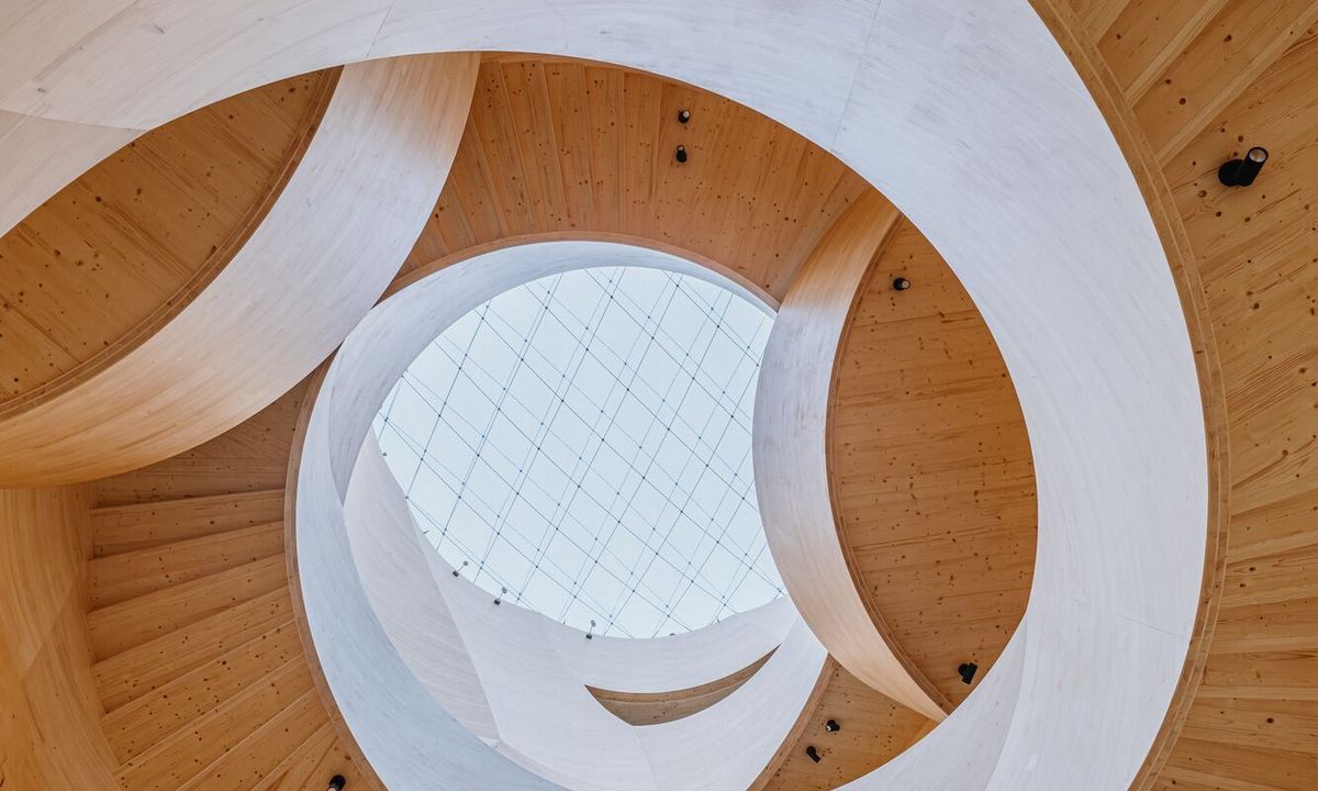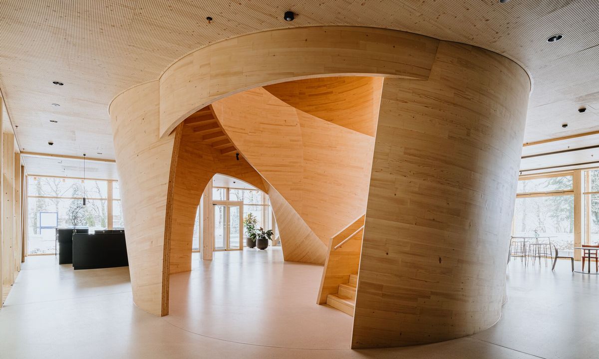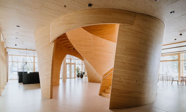 “The building was designed to welcome and inspire guests and employees alike, and to showcase Blumer Lehmann's expertise – from traditional woodworking to innovative free forms,” says Johanna Deinet, architect and partner at K&L Architekten AG, the architectural firm responsible for the project. The heart of the state-of-the-art timber construction, which is used as an office and reception building, is the atrium with the free-form staircase that gave the “parent company” its name. The design and timber construction technique of the free-form staircase made of curved solid wood panels was developed in collaboration with the ICD Institute for Computer-Based Design and Construction at the University of Stuttgart. It penetrates all five floors of the building and is both a vertical access zone and an identity-creating communication space. The curved atrium surfaces allow views in and out, forming seating niches and balconies that connect the atrium with the surrounding floor levels.