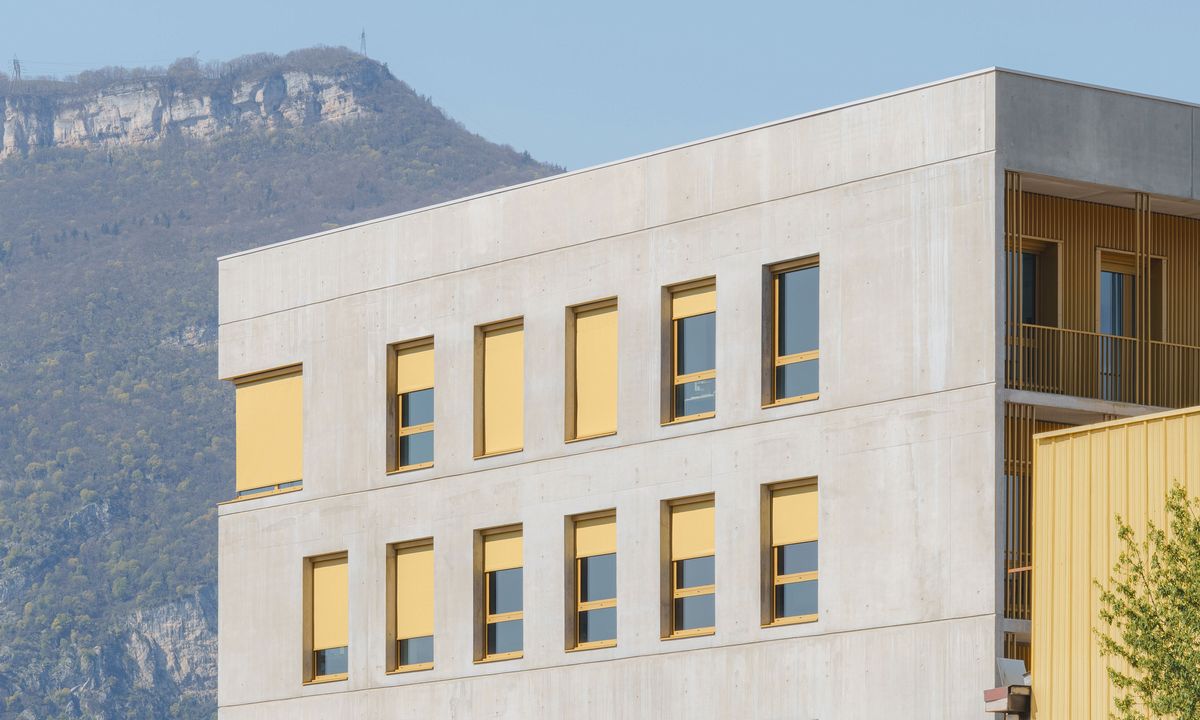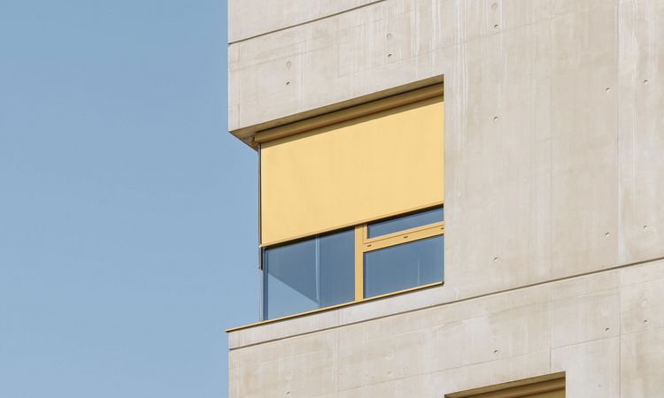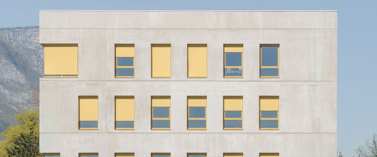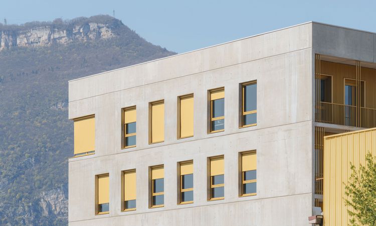 The new Griesser Soloscreen facade awnings that grace the new headquarters of Cuynat Construction in Grenoble (France) serve as a genuine eye-catcher. The colorful highlights aren’t just a perfect visual fit with the building’s rough-concrete finish: they’re an ideal complement, too, to its minimalist architectural style.