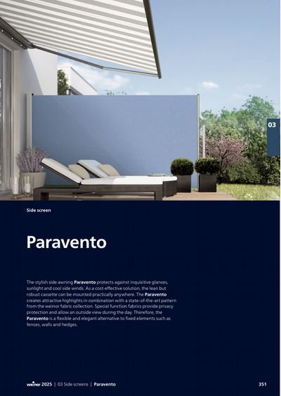 When you want to protect yourself completely against unwanted solar radiation and curious gazes, you pull the Paravento lateral privacy and solar shading panel. Side walls provide protection against sunlight, glare and wind. In addition, they also protect privacy. The fabric, which is securely stored in a cassette, is simply rolled in or out. The cassette can be readily removed in winter.
