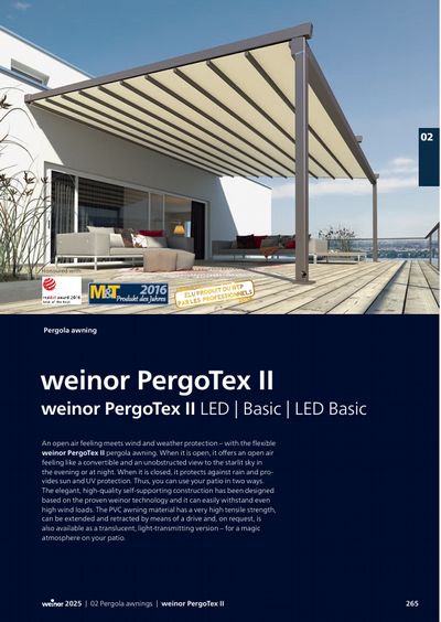 Protection against wind, rain and UV radiation – as well as a great fresh air feeling: the pergola PergoTex II awning is versatile to use and gives you more time outdoors. If you would like to enjoy the sun, just push a button – and the fabric retracts. If the weather takes a turn for the worse, just close the folding awning again. You are protected from the rain in no time – without leaving your patio.