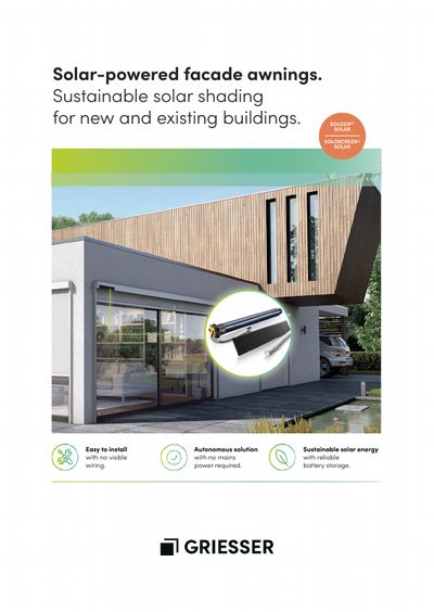 At the heart is the solar power kit, with which they all come as standard. The kit, which uses renewable solar energy to comfortably open and close the shading system, consists of a radio-controlled motor, a battery and a solar panel, all fully pre-wired. Once the easily accessible battery is connected via its pre-installed plug, the Griesser sustainable solar shading product is ready for use.