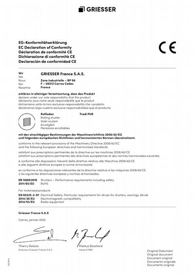 The Tradi PUR built-in rolling shutter can be installed not only in new construction but also in remodels and renovations into existing rolling shutter boxes or headers, in other words, it is completely invisible when open. The self-supporting system of Tradi PUR ensures simple and quick installation. The foamed, aluminum slats of Tradi PUR are available in three heights, 37 mm, 41 mm and 52 mm.